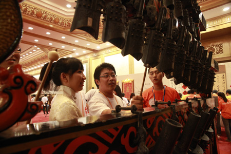 參觀結束后,一場精彩驚艷的大型文藝聯歡活動在萬人大禮堂舉行。聯歡活動由來自大陸央視和臺灣東森電視臺的主持人共同主持,光彩艷麗的唐宋元明清服飾、美輪美奐的千手觀音、神奇莫測的劉謙魔術,別具特色的臺灣原住民舞蹈,讓廣大青年大飽眼福;大陸和臺灣青年歌手聯袂演出且以閩南語發聲讓臺灣青年們倍覺親切,雖處異鄉猶感在家;周杰倫、林宥嘉、成龍、韓紅、宋祖英、姚明、王楠、林丹等兩岸明星大腕的加盟出演,更把現場氣氛推向高潮,雷鳴般的掌聲和吶喊聲此起彼伏。