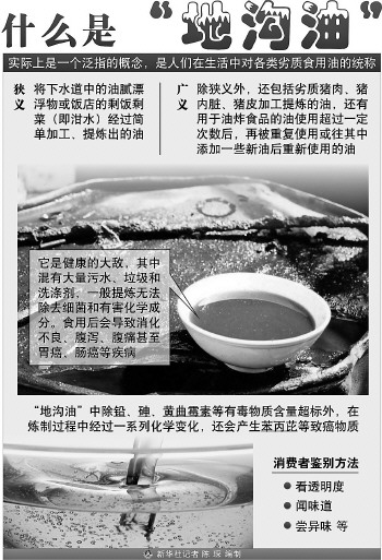 研究表明,長(zhǎng)期攝入地溝油會(huì)對(duì)人體造成明顯傷害,如發(fā)育障礙、易患腸炎,并有肝、心和腎腫大以及脂肪肝等病變。而地溝油中的主要危害物之一黃曲霉素是一種強(qiáng)烈的致癌物質(zhì),其毒性是砒霜的100倍。另一個(gè)問題是倫理上的,別人吃過的油,在下水道里變質(zhì),再撈上來,你能吃得下去嗎? 那么,有沒有一種簡(jiǎn)便的方法,可以鑒別地溝油呢?我們不妨聽聽食品科學(xué)專家和業(yè)內(nèi)人士怎么說。 1、科學(xué)鑒別地溝油 目前沒有好辦法 在一個(gè)注重食品安全的時(shí)代,理想的狀態(tài)是,你下館子,隨手掏出一張?jiān)嚰埥讲死?過一會(huì)兒拿出來跟譜表比比,然后大叫:“掌柜的,換油!” 2、傳統(tǒng)的檢測(cè)方法 都有一定局限性 在科研工作者看來,治理地溝油的難點(diǎn)在于,經(jīng)過洗滌、蒸餾、脫色、脫臭等精煉過程后,單從外觀和感官上,很難區(qū)分地溝油和普通油。不法商販還會(huì)把地溝油摻入食用油中,如果含量較少,更是難以檢測(cè)。 3、鑒別地溝油 冰箱顯身手? 曾在北京多家大酒樓擔(dān)任總廚、高管的特級(jí)廚師馮鵬說,一般情況下,地溝油和普通油無法區(qū)分,進(jìn)貨時(shí)難免上當(dāng)。他只能通過實(shí)踐來判斷:飯館炒菜之前一般要先過油,在這道“滑油”工序中,好油可反復(fù)使用七八次,而地溝油最多使用三次就會(huì)變黏,而且有哈喇味兒。 “另外,室外溫度較低時(shí),地溝油會(huì)像棕櫚油一樣凝固,所以常有人用地溝油冒充棕櫚油。”馮鵬說,冬天可以據(jù)此鑒別地溝油,夏天則可通過冰箱來檢驗(yàn)。一些媒體認(rèn)為地溝油有味道,可以聞出來,此外里面含水多,下鍋會(huì)爆響,馮鵬認(rèn)為這些都是無稽之談,因?yàn)樗緭讲贿M(jìn)油中,且地溝油也沒什么異味。 4、我們?cè)撊绾巍¤b別地溝油? 一看。看透明度,純凈的植物油呈透明狀,在生產(chǎn)過程中由于混入了堿脂、蠟質(zhì)、雜質(zhì)等物,透明度會(huì)下降;看色澤,純凈的油為無色,在生產(chǎn)過程中由于油料中的色素溶于油中,油才會(huì)帶色;看沉淀物,其主要成分是雜質(zhì)。 二聞。每種油都有各自獨(dú)特的氣味。可以在手掌上滴一兩滴油,雙手合攏摩擦,發(fā)熱時(shí)仔細(xì)聞其氣味。有異味的油,說明質(zhì)量有問題,有臭味的很可能就是地溝油;若有礦物油的氣味更不能買。 三嘗。用筷子取一滴油,仔細(xì)品嘗其味道。口感帶酸味的油是不合格產(chǎn)品,有焦苦味的油已發(fā)生酸敗,有異味的油可能是地溝油。 四聽。取油層底部的油一兩滴,涂在易燃的紙片上,點(diǎn)燃并聽其響聲。燃燒正常無響聲的是合格產(chǎn)品;燃燒不正常且發(fā)出“吱吱”聲音的,水分超標(biāo),是不合格產(chǎn)品;燃燒時(shí)發(fā)出“噼啪”爆炸聲,表明油的含水量嚴(yán)重超標(biāo),而且有可能是摻假產(chǎn)品,絕對(duì)不能購(gòu)買。 五問。問商家的進(jìn)貨渠道,必要時(shí)索要進(jìn)貨發(fā)票或查看當(dāng)?shù)厥称沸l(wèi)生監(jiān)督部門抽樣檢測(cè)報(bào)告。 |